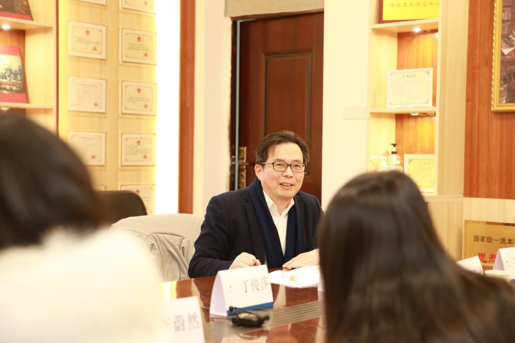 黄岭峻教授以风趣的语言讲述了自身与思政课结缘的故事,与青年思政课教师分享了思政教学的经验。他告诫青年思政课教师,既要注重特殊意识,又不要过分强调特殊意识,要自强不息;要强化系统学习,用心做科学研究,不断提升专业能力。同时,他用“四个一”即要一表人才、一手好字、一口普通话、一肚子学问,来勉励青年思政课教师。在现场互动环节中,丁俊萍和黄岭峻两位教授还针对“思政课教师怎样才能一直保持激情?”“思政课教师如何申报科研课题?”等一些青年思政课教师关心的问题,进行了逐一回答。