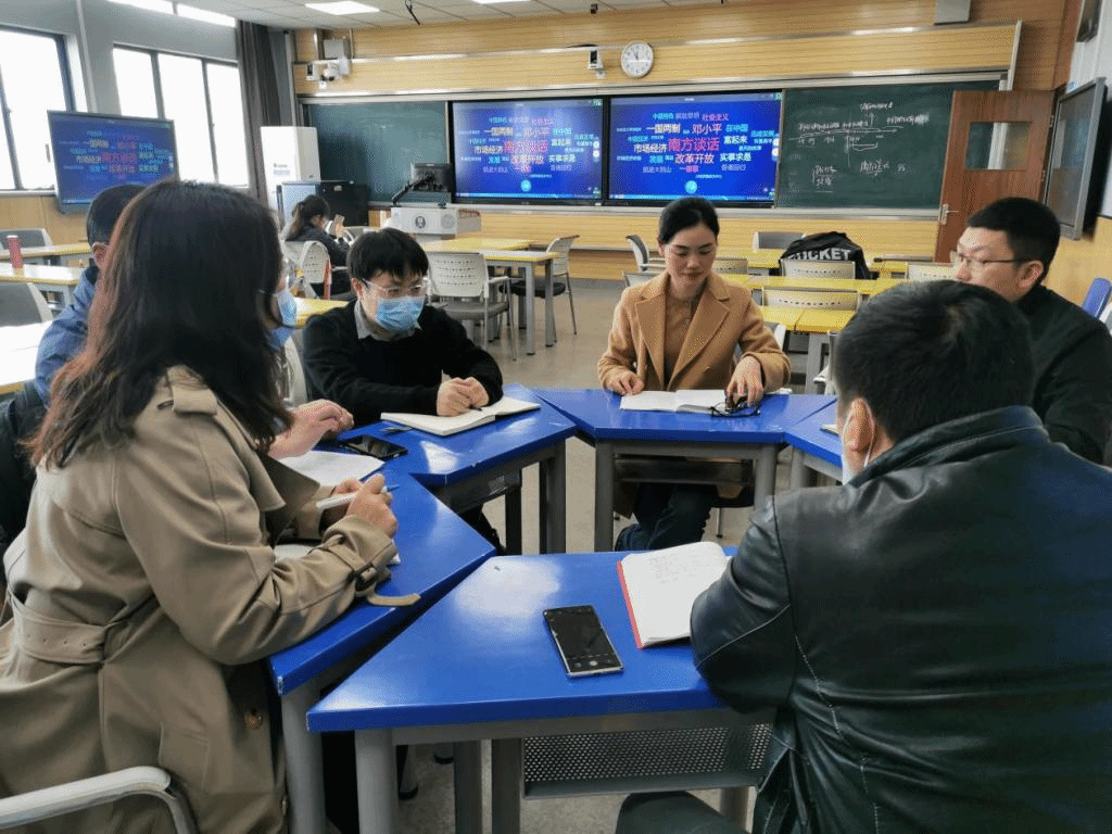 活动分为两阶段进行,第一阶段,老师们集体来到8414教室进行听课,姚金艳老师针对“邓小平理论形成的背景和条件”等内容进行了现场授课。课后,老师们对姚金艳老师的授课实况从课时安排、互动频率、提问方式、语言规范等方面提出了意见和建议。