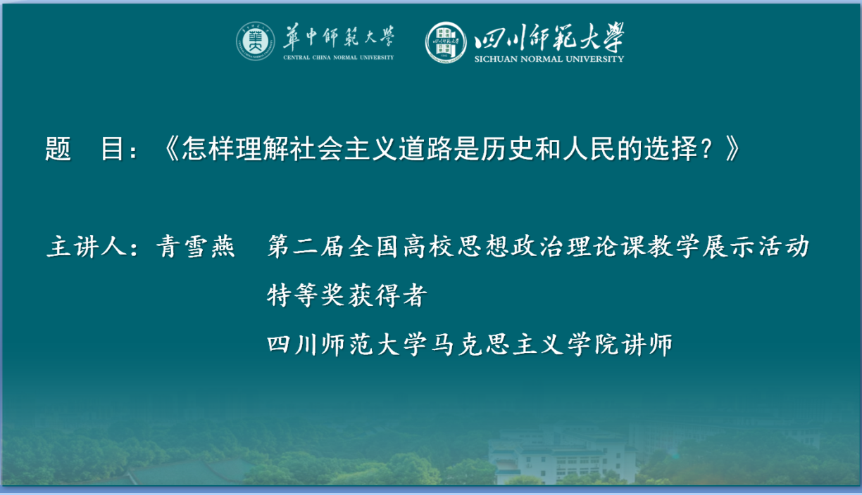 在教学展示阶段,第二届全国高校思想政治理论课教学展示活动特等奖获得者、四川师范大学马克思主义学院青雪燕老师结合自身课堂教学,做了题为《怎样理解社会主义道路是历史和人民的选择?》的教学分享。青雪燕老师以问题链的形式从“思想牵引:中国共产党以建设社会主义并最终实现共产主义为己任”“历史选择:中国走向社会主义具有历史必然性”“现实追求:社会主义前途是符合现实国情的应然选择”“人民认同:社会主义道路是广大人民的共同愿望”四个方面进行了精彩展示,层层递进,逻辑清晰严密、引经据典,步步深入,犹如抽丝剥茧一般,最后得出一个让人非常信服的结论。青雪燕老师声音甜美、授课既有理论深度,又契合学生实际,赢得了与会老师们的普遍赞誉。
