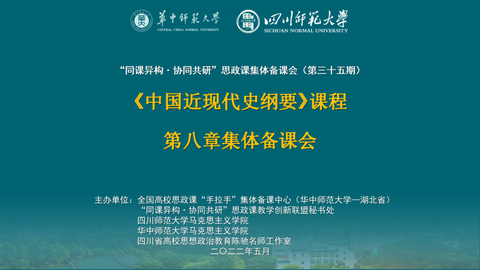 习近平总书记观摩中国人民大学思政课智慧教室现场教学时强调“讲好思政课不仅有‘术’,也有‘学’,更有‘道’。”并提出思政课的本质是讲道理,要注重方式方法,把道理讲深、讲透、讲活。为进一步贯彻落实习近平总书记在中国人民大学考察时的讲话精神,提升思政课教学的针对性和实效性,5月29日上午,由全国高校思政课“手拉手”集体备课中心(华中师范大学)、“同课异构·协同共研”思政课教学创新联盟秘书处、四川师范大学马克思主义学院、四川省高校思想政治教育陈驰名师工作室和华中师范大学马克思主义学院共同主办的“同课异构·协同共研”“中国近现代史纲要”(以下简称“纲要”)课第八章集体备课会在“云端”举行。此次集体备课会由华中师范大学马克思主义学院中国近现代史纲要教研部部长教授、博士生导师何家伟主持。