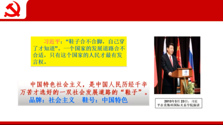 平台出品,必属精品。场场经典,期期必守!“四双鞋”经典生动。走社会主义道路有先进的中国共产党的理想牵引、 是历史的必然选择、是符合国情的应然选择、还是人民的共同愿望。从此对“历史和人民的选择”这一问题有了更深刻的认知,为一线教师坚定道路自信并传授道路自信提供了鲜活案例。感恩集体备课平台,感恩这个美好的新时代,让我们有这样的机会学习和进步!