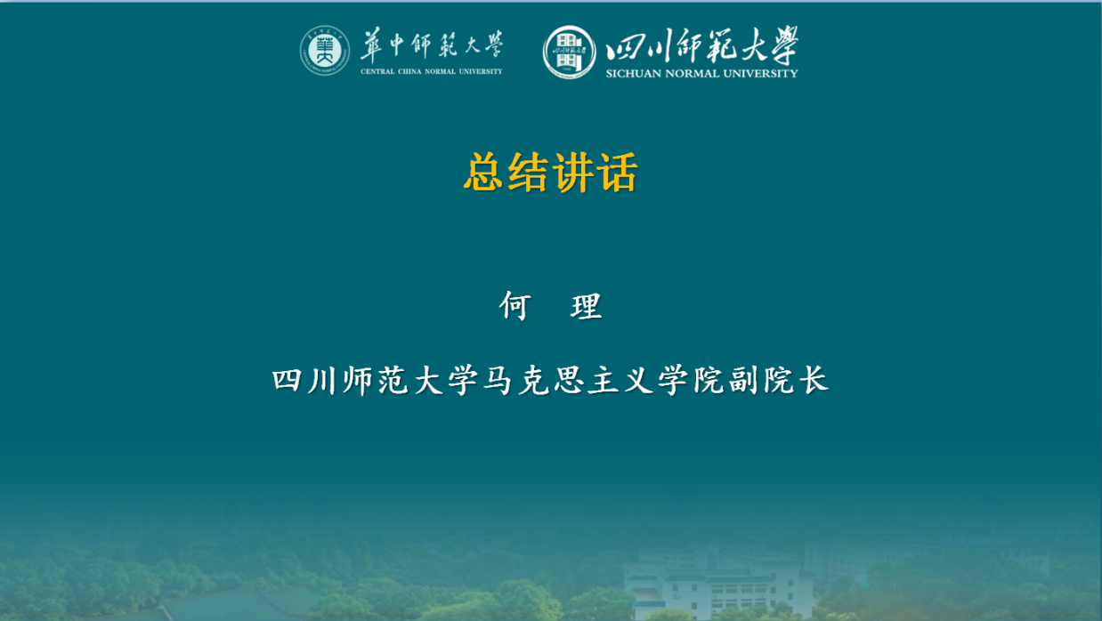 最后,四川师范大学马克思主义学院副院长何理教授作总结发言。何院长指出,本次集体备课会的与会专家及教师讲解很深刻、研讨分享有温度、交流内容有广度、思考见解有深度、教学设计有亮度,足见深厚的学术功底,对思政课无比深爱的人格魅力和兢兢业业的敬业精神,给全体思政教师留下了深刻的印象。期盼在今后的集体备课会中能继续携手新老朋友,共同交流、共同进步、共同协力提升教学技能,推进思政课的高质量发展。