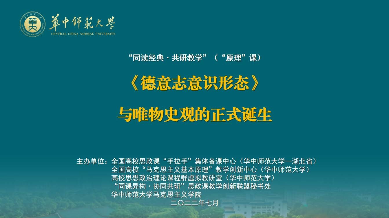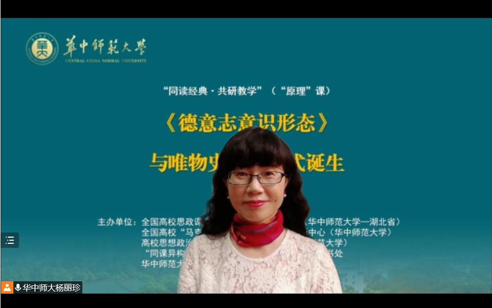 马克思主义学院讯(通讯员 陈凤)为进一步夯实思想政治理论课教师马克思主义理论功底,引导教师读原著、学原文、悟原理,提升教学的理论深度,7月17日上午,由全国高校“马克思主义基本原理”教学创新中心(华中师范大学)、高校思想政治理论课程群虚拟教研室(华中师范大学)、全国高校思政课“手拉手”集体备课中心(华中师范大学—湖北省)、“同课异构•协同共研”思政课教学创新联盟秘书处和华中师范大学马克思主义学院共同主办的“同读经典•共研教学”(“原理”课)集体备课(总第38期)在“云端”成功举行了教研集体备课会。我院教授、博士生导师杨丽珍教授作了“《德意志意识形态》与唯物史观的正式诞生”专题报告。“创新中心”负责人、华中师范大学马克思主义学院马克思主义基本原理教研部部长丁茜主持了本次活动。