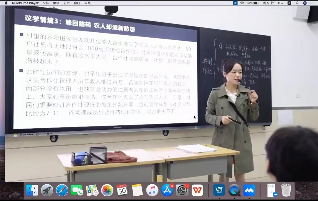 活动伊始,方敏老师播放了自己参赛的教学实录展示,在授新课之前,方老师设置了情景角色扮演的教学导入,同学们在情景剧中分别扮演不同的角色,从不同的立场出发为“水稻销售”提出解决方法。随后方老师以情景剧为依托,顺利过渡到议学活动“在乡村振兴路上,枝柘坪人为什么会感到迷茫?”,随后同学们根据议学提示又发表了不同的看法,体现了深度思考。方老师还利用一例到底、层层递进的议题来拓展思维、激发学生思考,提高学生分析与解决问题的能力。方老师把情景结构、任务结构、活动结构、知识结构相结合起来,利用议题式教学完成了本堂课的教学目标,落实了学科核心素养。方老师还布置了实践性作业“助力乡村振兴,促进共同富裕”的提案并以朗读李大钊的《青春》作为课堂升华。整堂课过渡自然,水到渠成。方老师播放了课堂实录后,对于这节课的备课过程做了详细的介绍以及进行了自我反思。备课过程一共分为三个阶段“前期:研读方案,运筹帷幄。中期:凝心聚力,千磨百炼。后期:细节管理,锦上添花。”整个过程介绍了对于大单元教学设计“从无到有、从陌生到熟悉”的心路历程。随后对于这节课又做了详细的自我反思。