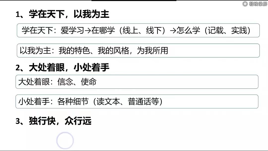 谭老师随后情真意切、接地气的分享了备课的心路过程以及成为一名合格人名教师的建议。谭老师一共分享了三个心得体会,分别是“学在天下,以我为主。大处着眼,小处着手。独行快,众行远”。首先解释了“学在天下,以我为主”就是作为一名合格的思想政治课教师不能只局限于学习某一领域或某一空间的知识,我们还要广泛的学习其他领域的知识。保持一种谦虚的态度,广泛的向他人学习,不断提升自己的知识储备。其次解释了“大处着眼,小处着手”,提出了“好记性不如烂笔头”,我们在日常的学习过程中,要时刻记录生活的点点滴滴,不断记录,不断学习。最后解释了“独行快,众行远”,要讲究团队合作,相互学习交流,共同进度。