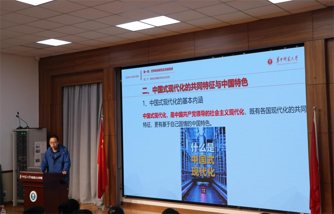 来自“马克思主义基本原理”教研部的秦志龙教师围绕中国式现代化融入原理课教学,以《矛盾的普遍性和特殊性及其相互关系—兼谈中国式现代化的共同特征与中国特色》为题,着重讲了“中国式现代化的共同特征与中国特色”和“中国式现代化的世界历史意义”两个问题,指出可以从经济、政治、文化三位一体的角度及构成要素的角度把握中国式现代化的共同特征,提出中国式现代化没有脱离世界现代化潮流,而是以其独特创造和伟大成就丰富了人类走向现代化的途径,具有重大世界历史意义。