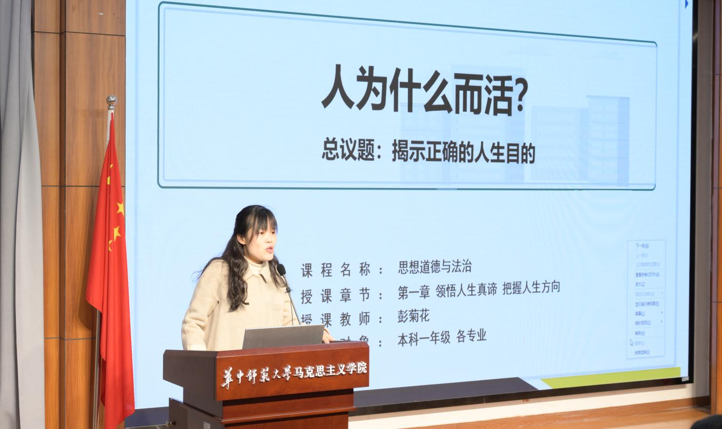 来自“思想道德与法治”教研部的彭菊花教师围绕《思想道德与法治》第一章“领悟人生真谛,把握人生方向”内容进行了教学展示。她的题目是“人为什么而活”,采取的是议题式教学,总议题:揭示正确的人生目的,设置了三个分议题:1.人为物质而活?还是为精神而活?2.人为眼前而活?还是为长远而活?3.人为自己而活?还是为他人而活?强调学生的探究学习、合作学习,每个议题在学生充分讨论的基础上,加以理论阐释,引导学生得出正确答案,弄清楚当代大学生应该树立什么样的人生目的。