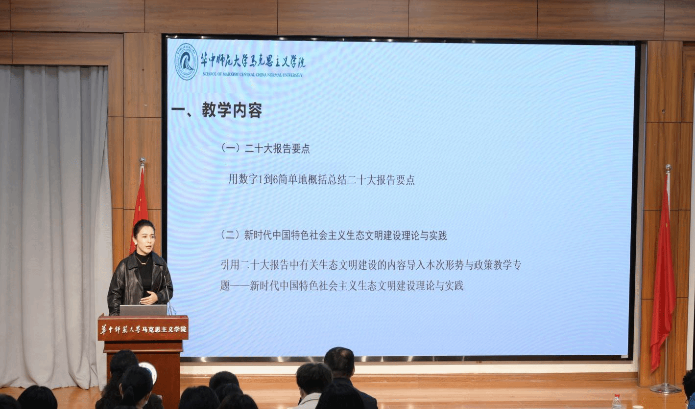 在教学展示环节,共有六名思政课教师进行教学展示。首先进行展示的是承担“形势与政策”课教学任务的美合日姑丽·阿不都外力教师,她从教学内容、教学目标、教学过程三个方面,结合授课对象的专业、年级特色,给大家带来了一场别开生面的说课演示。她对《新时代中国特色社会主义生态文明建设理论与实践》这一专题学习给出了自己的理解与认识,教学设计思路明晰、授课方式生动有趣,准确讲解了对教学目标、教学重难点、教学过程的理解,充分展示了我校专职辅导员队伍的专业素养和知识储备。最后,她分享到上好每一节思政课堂一定是师生双向赋能的,教师需要以富有感染力的宣讲方式,让深奥难懂的理论知识鲜活起来,用青年学生喜闻乐见的形式授课,课堂中互相给予正向反馈,需要教师一步步提升理论教育的亲和力,真正做到入脑入心。