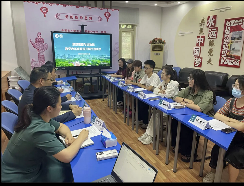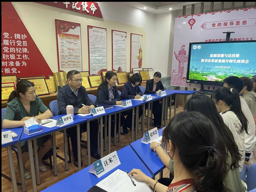 马克思主义学院讯(通讯员 赵婷)为深入开展学习习近平新时代中国特色社会主义思想主题教育,学思想、强党性、重实践、建新功,针对课程教学和人才培养工作展开调查研究,发现问题、提出对策,解决问题,切实提高主题学习实效和教学育人成效。5月26日下午,思想道德与法治教研部党支部在一号楼党员活动室举行思想道德与法治课教学改革质量提升师生调研座谈会。思想道德与法治教研部党支部书记徐秉国、副书记梅萍和李芳、彭菊花、刘梦觉等教师党员以及来自社会学院的汪米兰、美术学院的赵珂慧、教育学院的海锦玲、经管学院的刘杨韬、文学院的纪雯婕、音乐学院的周芸伊、新闻与传播学院的梁尚衡等学生代表参加了本次调研座谈会。会议由党支部副书记、教研部部长梅萍主持。