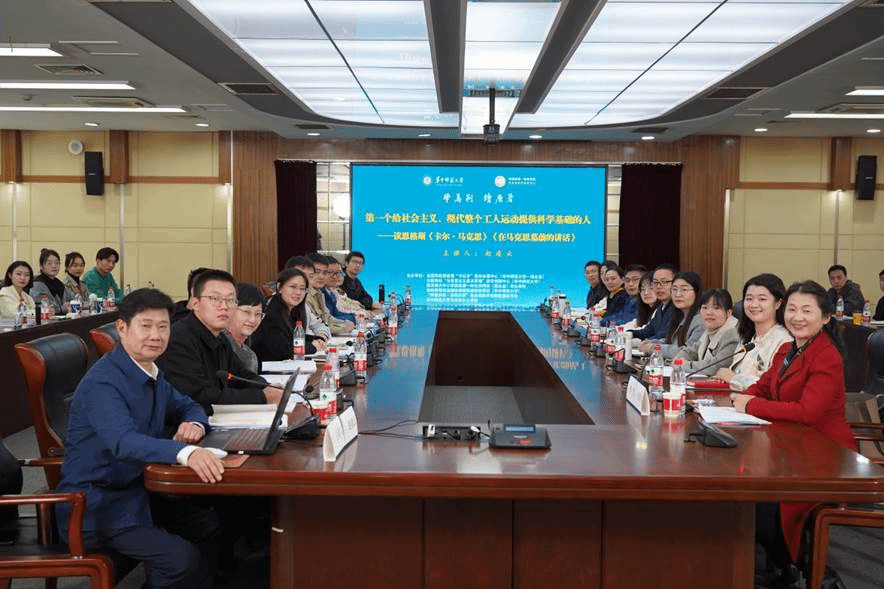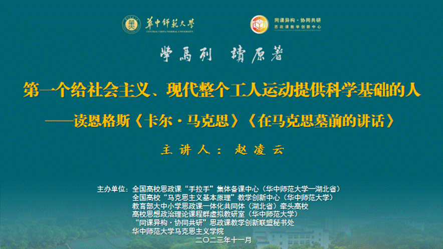 马克思主义学院讯(通讯员 李芳)为帮助思政课教师提升马克思主义理论功底,夯实原著基础,不断增强思政课的思想性、理论性和亲和力、针对性,11月23日上午,全国高校思政课“手拉手”集体备课中心(华中师范大学—湖北省)、全国高校“马克思主义基本原理”教学创新中心(华中师范大学)、教育部大中小学思政课一体化共同体(湖北省)牵头高校、高校思想政治理论课程群虚拟教研室(华中师范大学)、“同课异构·协同共研”思政课教学创新联盟秘书处、华中师范大学马克思主义学院通过线上线下相结合的方式,在逸夫国际会议中心2楼报告厅及线上直播平台举办“学马列·读原著”思政课教师马列经典著作读书班(第1期),华中师范大学原党委书记赵凌云教授主讲,导读主题为“第一个给社会主义、现代整个工人运动提供科学基础的人——读恩格斯《卡尔·马克思》《在马克思墓前的讲话》”,华中师范大学思政课教师代表等现场参与学习,本次导读活动通过线上平台同步直播。本期读书班由华中师范大学马克思主义学院副院长李芳教授主持。