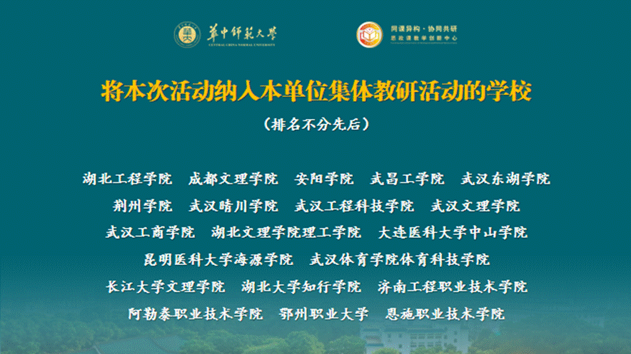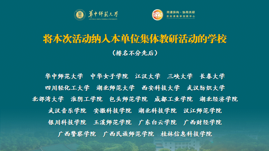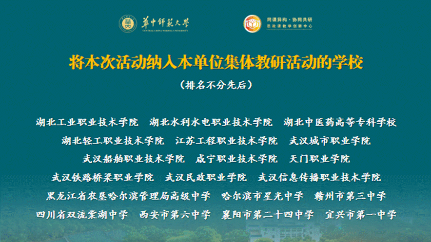 据悉,华中师范大学、中华女子学院、江汉大学、三峡大学、长春大学、四川轻化工大学、湖北师范大学、西安科技大学、武汉纺织大学、北部湾大学、淮阴工学院、包头师范学院、成都工业学院、湖北经济学院、武汉音乐学院、安徽科技学院、湖北科技学院、汉江师范学院、银川科技学院、玉溪师范学院、广东白云学院、广西财经学院、广西警察学院、广西民族师范学院、桂林信息科技学院、湖北工程学院、成都文理学院、安阳学院、武昌工学院、武汉东湖学院、荆州学院、武汉晴川学院、武汉工程科技学院、武汉文理学院、武汉工商学院、湖北文理学院理工学院、大连医科大学中山学院、昆明医科大学海源学院、武汉体育学院体育科技学院、长江大学文理学院、湖北大学知行学院、济南工程职业技术学院、阿勒泰职业技术学院、鄂州职业大学、恩施职业技术学院、湖北工业职业技术学院、湖北水利水电职业技术学院、湖北中医药高等专科学校、湖北轻工职业技术学院、江苏工程职业技术学院、武汉城市职业学院、武汉船舶职业技术学院、咸宁职业技术学院、天门职业学院、武汉铁路桥梁职业学院、武汉民政职业学院、武汉信息传播职业技术学院、黑龙江省农垦哈尔滨管理局高级中学、哈尔滨市星光中学、赣州市第三中学、四川省双流棠湖中学、西安市第六中学、襄阳市第二十四中学、宜兴市第一中学等64家单位将本期读书班纳入本单位集体备课教研活动。线上平台观看直播人数达5000余人次,点赞量达7000余人次,观众覆盖除西藏和港澳台之外的30个省(自治区、直辖市)。