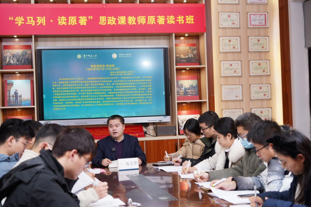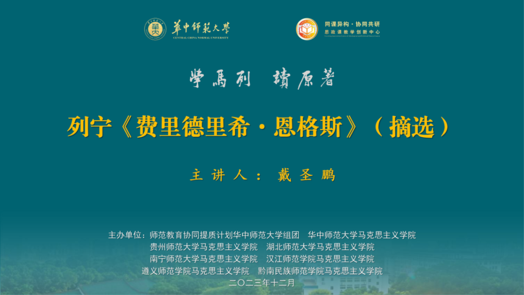 马克思主义学院讯(通讯员 闫燕)为帮助思政课教师提升马克思主义理论功底,夯实原著基础,不断增强思政课的思想性、理论性和亲和力、针对性,2023年12月17日上午,“学马列·读原著”思政课教师马列经典著作读书班(第2期)成功举办。本次活动由教育部师范教育协同提质计划华中师范大学组团华中师范大学马克思主义学院、贵州师范大学马克思主义学院、湖北师范大学马克思主义学院、南宁师范大学马克思主义学院、汉江师范学院马克思主义学院、遵义师范学院马克思主义学院、黔南民族师范学院马克思主义学院联合主办,华中师范大学国内合作与培训管理处提供支持,在华中师范大学马克思主义学院设置主课堂,在其他有关高校设置线下分课堂,通过教育部虚拟教研室平台和“腾讯会议”客户端线上直播。华中师范大学马克思主义学院副教授戴圣鹏导读列宁同志的《弗里德里希·恩格斯》,华中师范大学思政课教师代表现场参与学习。本期读书班由华中师范大学马克思主义学院副院长李芳教授主持。