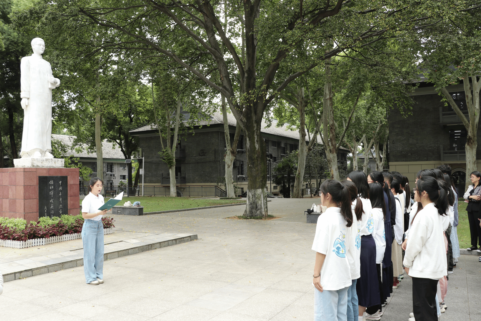 最后恽代英广场上的理想信念教育为活动收官。在邵彦涛的主持下,师生们共同聆听研习社成员讲述恽代英同志为革命事业不懈奋斗、坚守信仰的生平故事,感悟其崇高精神。随后,师生代表怀着崇敬之心,向恽代英同志雕塑郑重献花,以此表达对这位伟大校友的缅怀与敬意,让红色基因与革命精神在实地学习中融入心中,进一步坚定投身思想政治教育事业、传承教育家精神的信念。