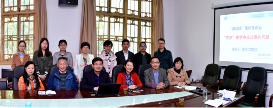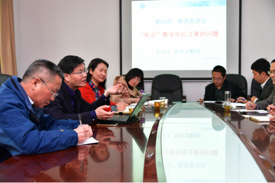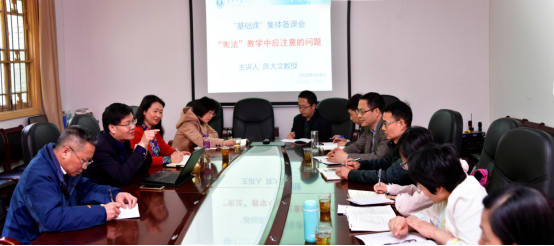 “基础”课中的“宪法”部分的教学一直是教学的重点和难点问题。为了更好地把握“宪法”部分的教学,提高教学的针对性和实效性,2018年4月8日上午,我院“基础”课教研室召开集体备课会,邀请教育部“思想道德修养与法律基础”分教学指导委员会副主任委员、同济大学特聘教授陈大文老师对“基础”课中的“宪法”部分的教学进行了专题指导。我院主管教学的李芳副院长、大理学院李乾夫副院长、“基础”课教研室梅萍主任、院长助理徐秉国老师和“基础”课教研室的全体任课老师余四川、周凤琴、何家伟、吴秀莲、薛惠、熊富标、孙清华及部分博士、硕士生参加了此次备课会。