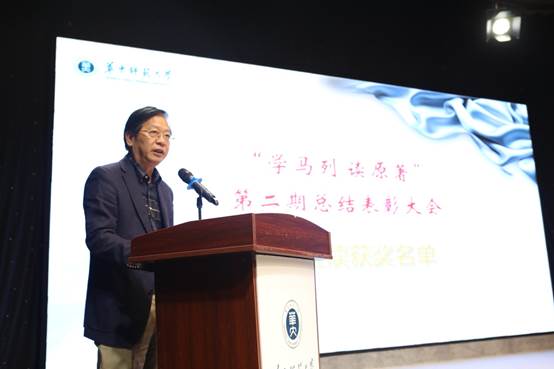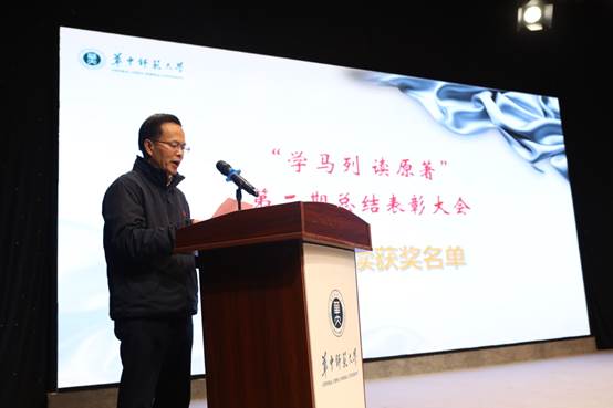 在经典导读之前举行了“学马列 读原著”第二期总结表彰大会,马克思主义学院副院长李芳教授代表主办单位作了热情洋溢的致辞,教务处副处长邱宝国、研工部部长马海波分别宣读本科生和研究生获奖名单,并与关工委副主任朱斌、马克思主义学院教师代表丁茜老师、邵彦涛老师一道为获奖学生颁奖。本科生获奖代表马可维和研究生获奖代表庹麒麟分别上台发言,他们汇报了参加“学马列 读原著”活动的心得和收获,并表示将以更大的理论自觉带动身边的同学积极参加活动,从“学马列 读原著”中汲取思想营养和精神力量,不忘初心、砥砺前行、学好本领、报效祖国。