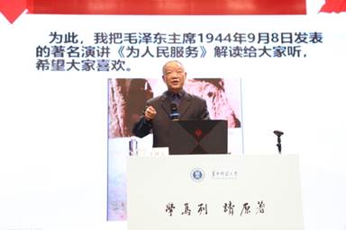 随后,我校马克思主义学院博士生导师、著名党史研究专家李良明教授以72岁的高龄、全程站立的姿态,用长达130多分钟的时间和极富感染力的语言,现场导读了毛泽东同志的经典著作——《为人民服务》。