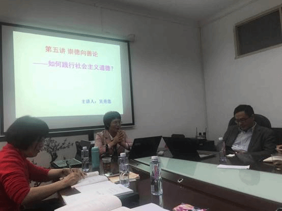 最后,由吴秀莲老师详细的展示了“崇德向善论”的课程设计,通过对“道”和“德”汉字发展史、说文解字、西方伦理学和语言学、词源、词义和概念的分析讲述道德的定义,并对道德的本质、功能以及发生作用的机制、来源和基础做了深入的理论分析,解释了道德和法律的关系。对人类优秀道德资源和中华传统美德向社会主义道德转化的过程进行了具体的阐述,并指出社会主义道德的核心是“为人民服务”,引导学生讨论和总结集体和个人的关系,从人生观、人生目的、个人发展等角度综合谈“为人民服务”的具体内涵等等。余四川老师表示,道德部分的讲述详细透彻、理论性强、资料丰富,徐秉国助理提出可以针对学生专业增添师德等具体职业道德的讲述。
