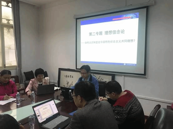 接着,由李春火老师进行第二专题“理想信念论”的课程展示。李老师认为应当通过导学部分调动课堂气氛,采用诗歌、故事、讨论等方式引导学生漫谈理想信念和自身的关系,并通过对人的社会性、王国维的“三境界”解读以及习近平对新时代青年“功崇惟志,业广惟勤”的要求来导入本专题的学习。在对理想信念的理性思考中阐述理想的内涵、本质和特征;在坚定崇高理想信念中解释何为崇高信念、为什么要信仰马克思主义以及怎样提升精神境界;在理想信念的实践中主要引导学生将自身的理想同实现中国梦进行有机的联系。邱杰院长表示这一专题内容丰富,紧扣教材。余四川老师表示课件中可以适当减少文字,突出重点和亮点,强弱得当的设计更能够吸引学生的兴趣,同时要做好对学生思维的启发工作,分配好讲授与学生自学的时间。徐秉国助理认为,这一专题应当比中学政治课程中的理想信念部分要更侧重理论性探讨,加入哲学上人为何要有理想、为何要有信念的探讨,进行理论深化。梅萍主任表示教学要突出重点,可以将“共同理想”作为重难点进行突破。