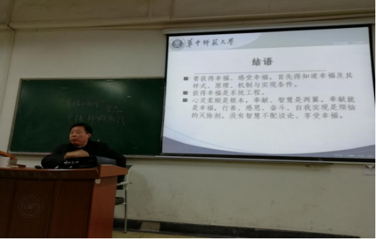 (通讯员:柯润芝)11月6日16时至17时40分,在华中师范大学8203“基础”课堂,由薛惠老师主持,马克思主义学院二级教授、博士生导师高新民老师以“幸福在哪里?----我的‘幸福学实验’的初步解答”为题开讲,此次讲授也是我院“名师讲思政课”系列活动之一。参加本次讲座的有经济与工商管理学院部分师生,还有来自其他学院的老师和同学,现场座无虚席。