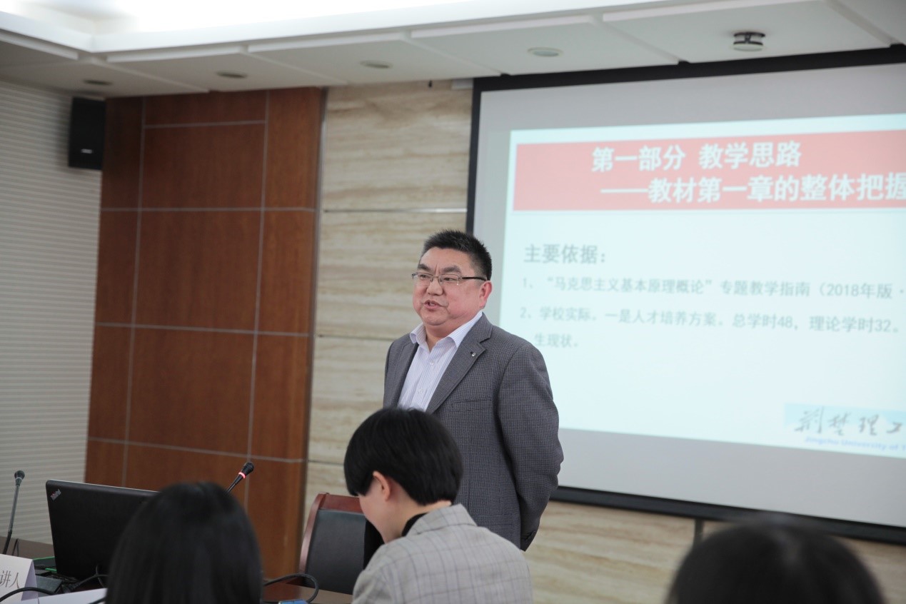 荆楚理工学院马克思主义学院刘祖峰副教授围绕《矛盾的统一性和斗争性及其在事物发展中的作用》分享了教学设计和教学思路。刘老师从学生实际出发,主要采取“原理+案例”的设计结构,将教材原理与实际案例相结合,例如引导学生分组讨论CUBA联赛中的哲学意蕴,通过球赛生动形象地讲解矛盾的同一性和斗争性的辩证关系。刘老师讲课吃透了教材和教学指南,针对学生现状,因材施教,体现了教无定法、贵在得法;真正做到了教材统一性和教学方法多样性的统一,教师的主导性和学生的主体性的统一。