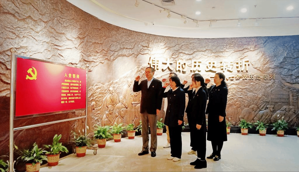 步入会址厅,映入眼帘的为一座承载厚重历史信息的浮雕墙,其上刻着“伟大的历史转折——八七会议历史陈列”的字样,以及“八七会议”召开时的情境和会后各地风起云涌地开展武装革命的场面。面对旁侧鲜红的党旗,全体党员佩戴党徽,举起右拳,在支部书记的带领下,一同庄严地重温入党誓词。