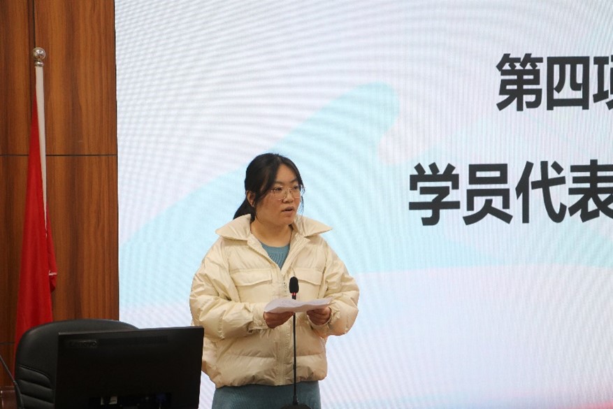 随后,马院20级思想政治教育专业硕士研究生林延华作为学员代表发言。她呼吁学员们:“作为入党积极分子,在今后的工作、学习与生活中,我们要以共产党员的标准严格要求自己,加强对党的历史、理论、方针政策的学习,切实提高自身政治素养;努力学习共产党员的优良传统和无私奉献的精神,学习他们艰苦奋斗、不畏艰险的精神,保持蓬勃向上、意气风发的斗志,紧密团结在党的周围,积极向党组织靠拢。”她代表全体学员真诚地向党组织表示:在本次培训中态度积极严肃、认真听讲积极参与线上线下学习活动,努力加深对党基础理论知识的理解,进一步端正入党动机,提高思想政治素质。