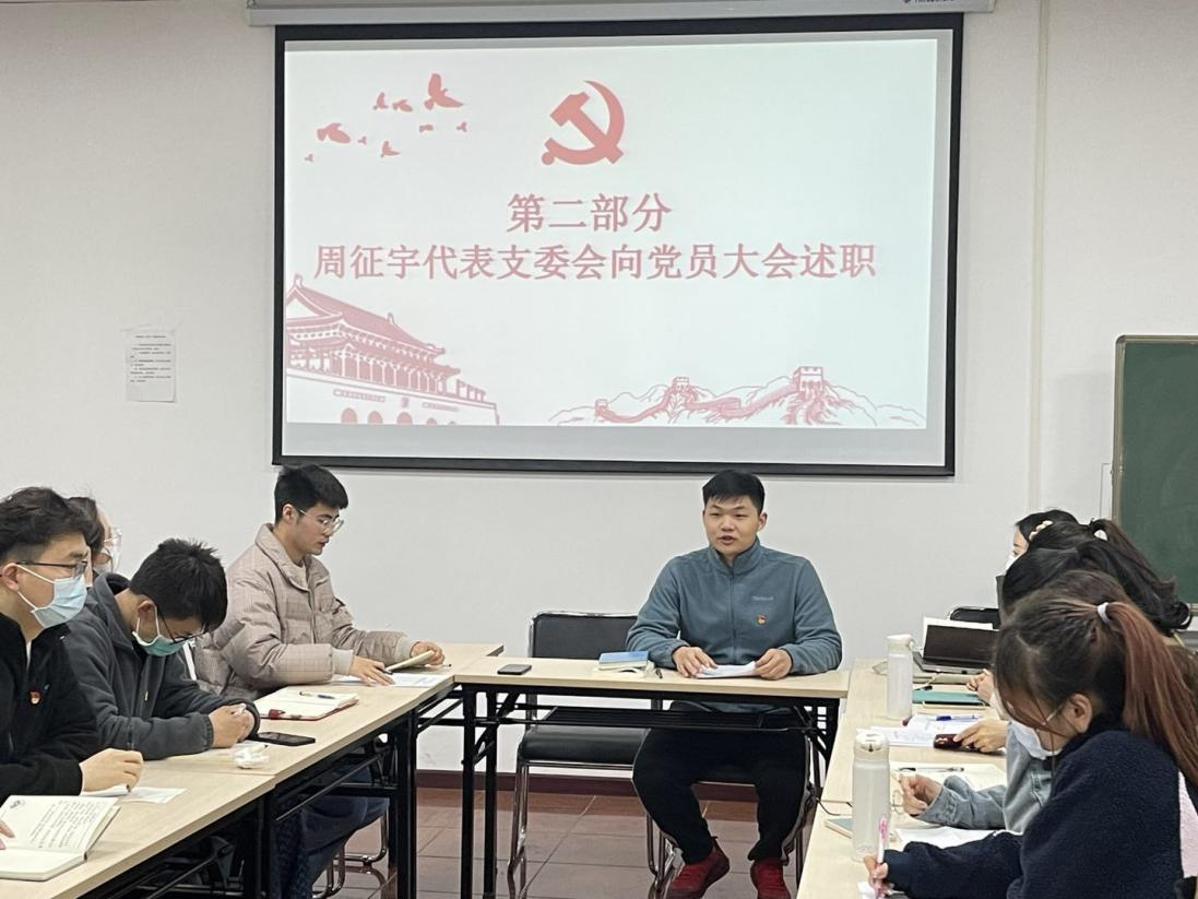 会议第二项,支部书记周征宇代表支委会向党员大会述职。不忘“来时路”,赓续“奋斗路”,周征宇同志从“笃行致远--以实践承载支部建设”、“踔厉奋发--以典型提振支部活力”、“守正创新--以制度护航支部发展”三个方面对全年支部党建工作进行汇报和总结。特别指出在支部活动建设上,支部通过以点带面,全面辐射的党史学习教育活动和以老带新、上下联动的支部常规组织生活,有效加强了主题教育,团结了支部力量,发挥了支部优势,取得了重要成就。