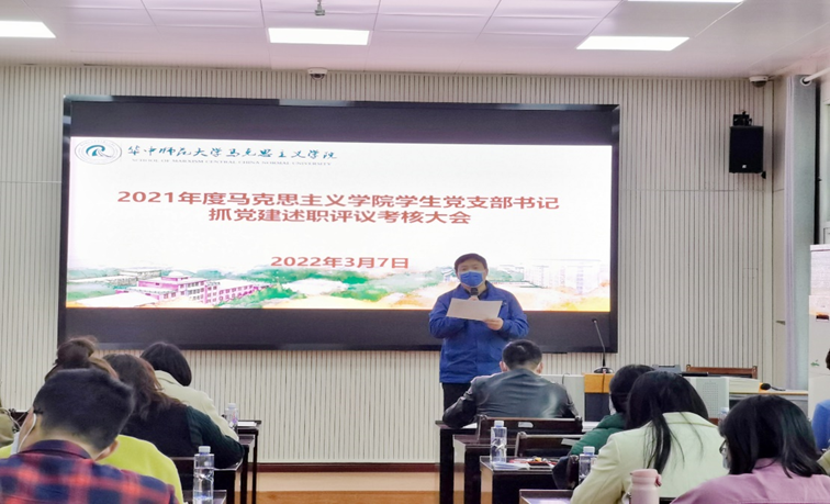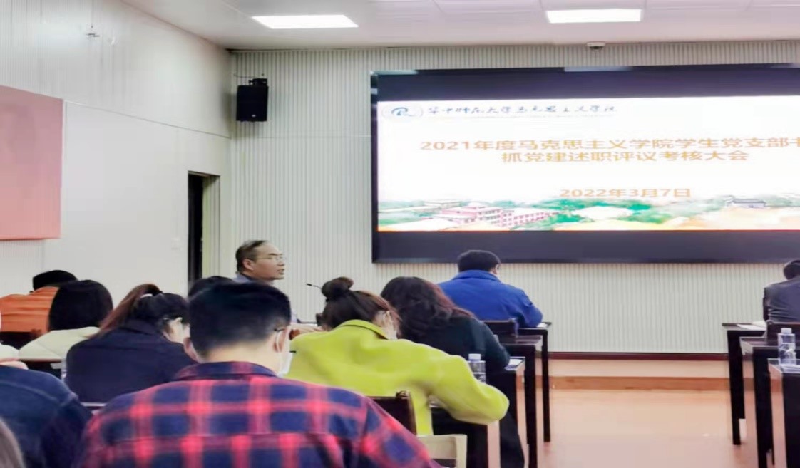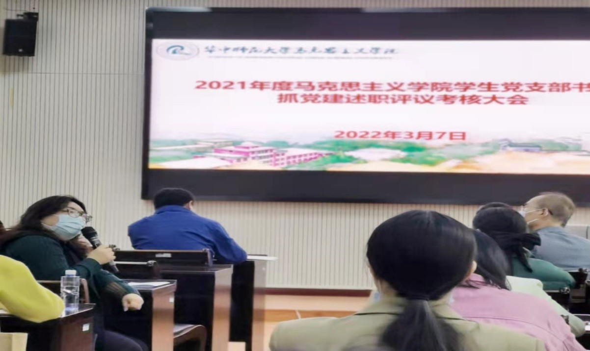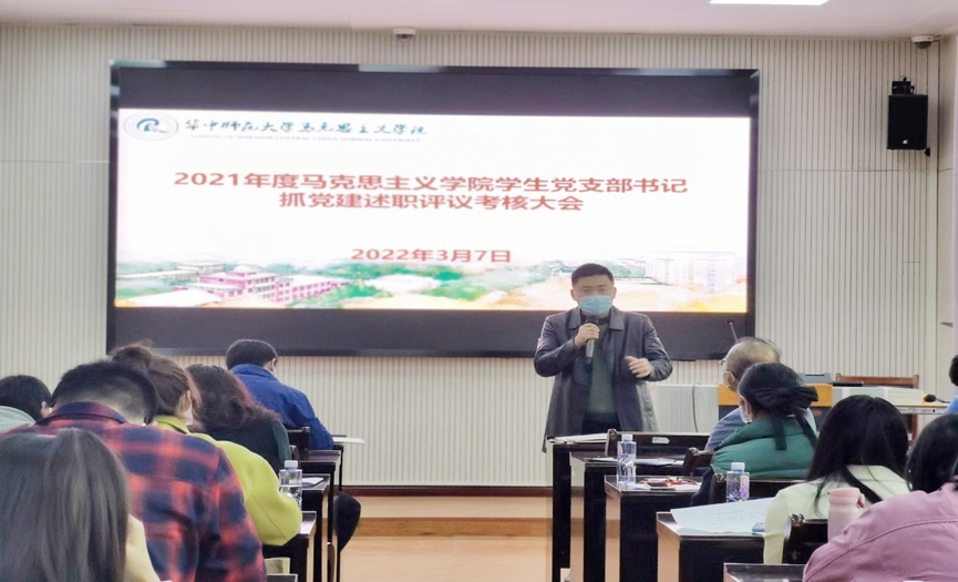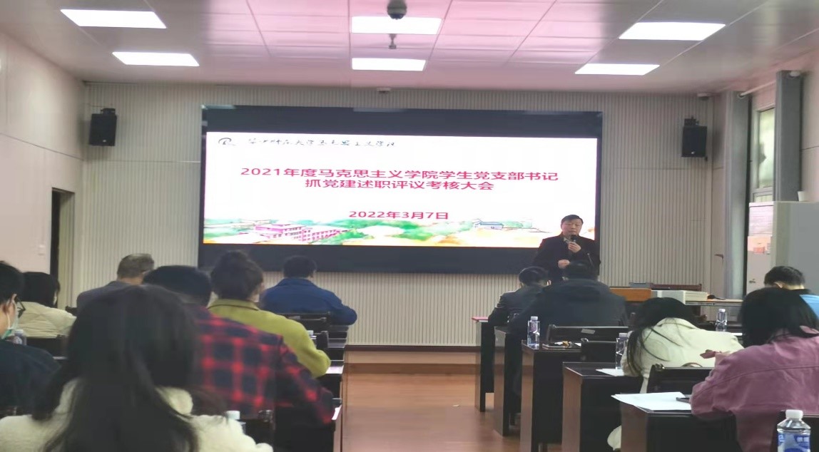 马克思主义学院讯(通讯员:余茂英 王海龙 摄影:程玉璐 )2022年3月7日,马克思主义学院2021年度学生党支部书记抓党建述职评议考核大会在马克思主义学院三楼学术报告厅举行,学院党委书记孙永祥、院党委副书记邵莉莉、党委委员副院长毛华兵、党委委员谢从高、党委委员李红伟、党委委员梅萍、党办主任王海龙及16个学生党支部书记及支委等参加了会议。会议由正处职组织员董俊敏主持。