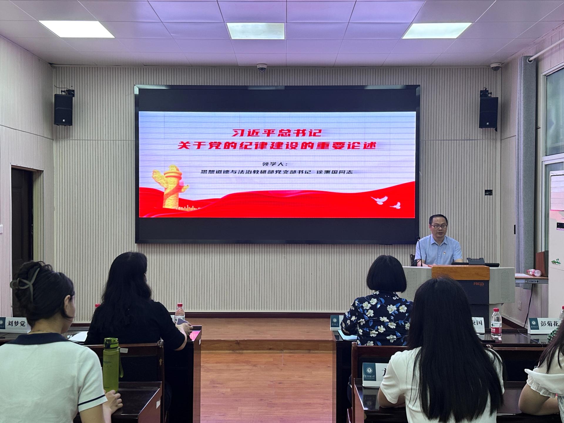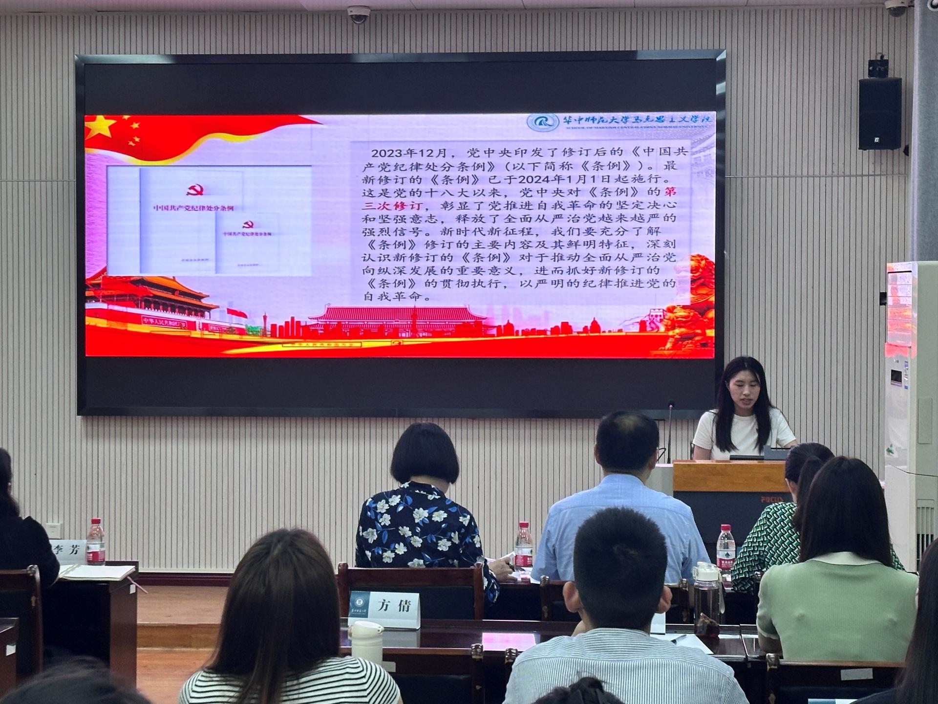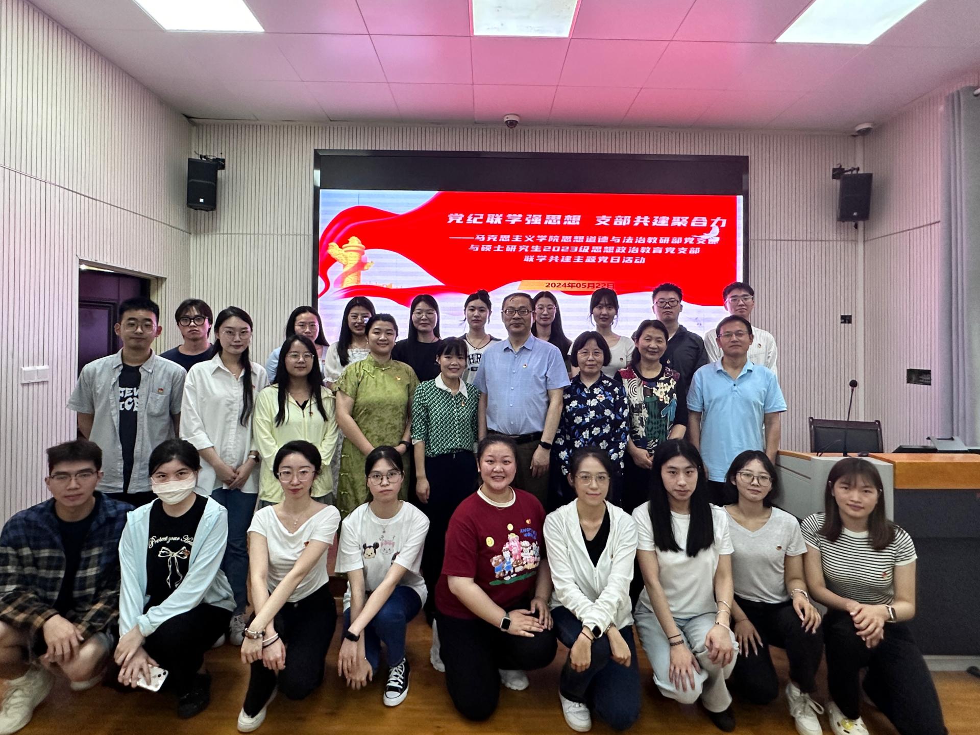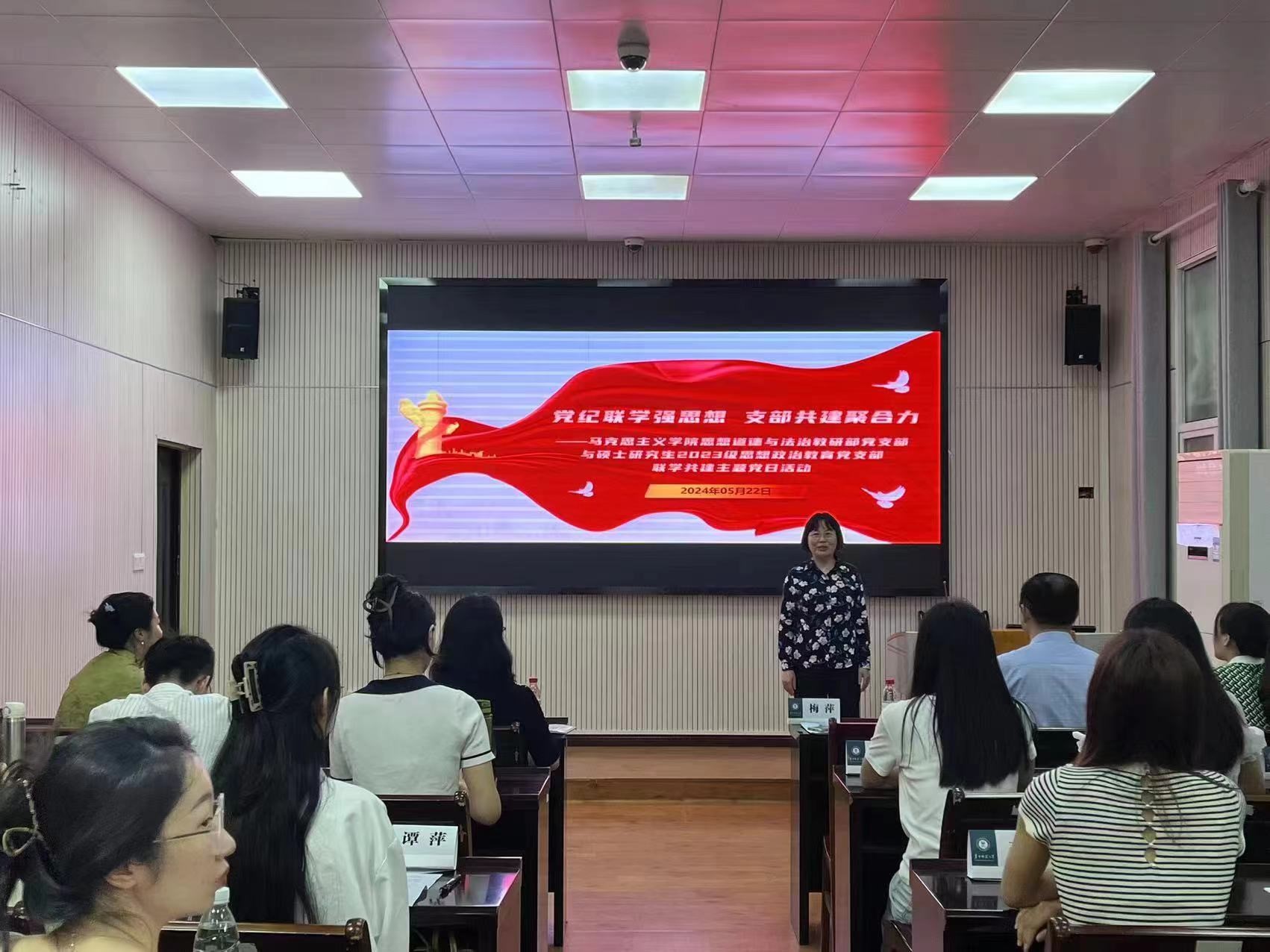 马克思主义学院讯(通讯员 刘卿卿)为深入领悟、贯彻落实习近平总书记关于党的纪律建设的重要论述精神,推动党纪学习教育入脑入心走深走实,引导党员真正把纪律规矩转化为政治自觉、思想自觉、行动自觉,2024年5月22日,马克思主义学院思想道德与法治教研部党支部联合硕士研究生2023级思想政治教育党支部于马克思主义学院三楼学术报告厅共同开展党纪学习教育主题党日活动。