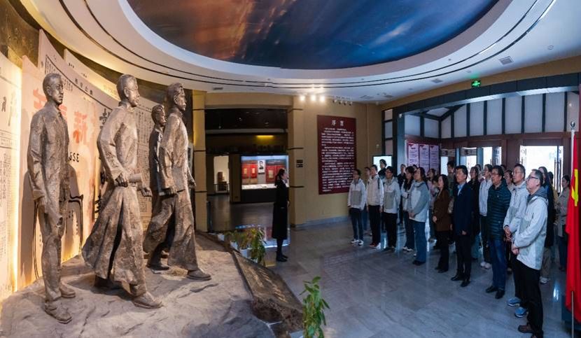 在武汉龙源红色报刊博物馆大厅,我院习近平新时代中国特色社会主义思想概论教研部党支部书记董小红带领全体师生党员重温入党誓词,面向党旗庄严宣誓。铮铮誓言时刻警醒着每一位党员牢记初心使命,坚定理想信念。