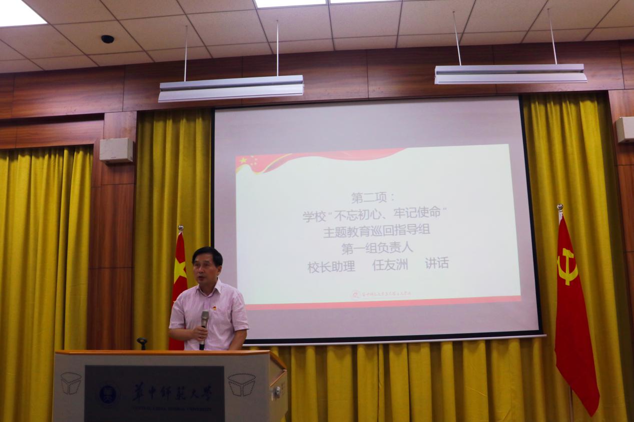 任友洲同志进行讲话,他首先介绍了学校贯彻“不忘初心、牢记使命”主题教育精神的相关情况,并就落实主题教育主要任务提出四点意见:开展主题教育时要着力在强化政治担当上作表率,着力在把牢政治方向上做文章,着力在提升质量标准上下功夫,着力在防止形式主义上保实效。同时,他就开展主题教育的五个重点问题以及主题教育期间教育部和学校巡回指导组的职责和任务作了详细说明。任友洲强调,指导组将认真学习贯彻落实习近平总书记重要讲话和重要批示指示精神,严格按照学校党委的相关要求,紧紧依靠学院党委开展工作,重点督查抓好主题教育的组织领导、动员部署,推动落实主题教育工作,并通过建立督导与领导工作机制,深入了解情况,提出意见建议,及时总结经验,严格遵守各项规章制度,坚持按纪律规矩办事,以实际行动树立指导组的良好形象。
