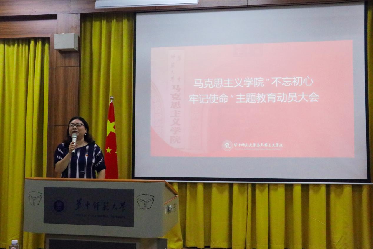 马克思主义学院讯(通讯员 林志生;摄影 石佳鑫)9月25日下午,马克思主义学院“不忘初心,牢记使命”主题教育动员大会在一号楼1101教室举行。学校“不忘初心、牢记使命”主题教育巡回指导组第一组负责人、校长助理任友洲,副组长、学校办副主任罗高峰,学院党委委员、教师党员与学生党员代表等参加。会议由学院党委副书记邵莉莉主持。