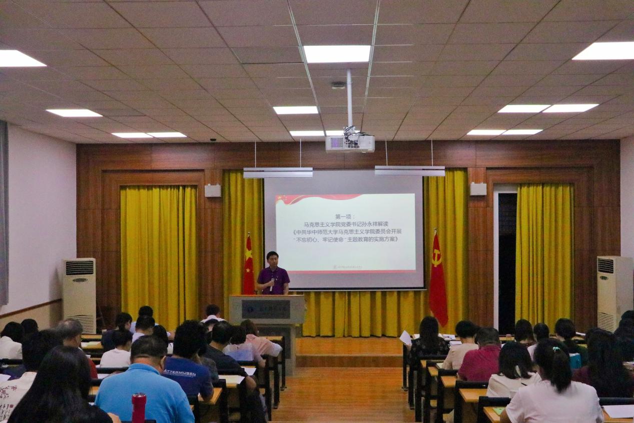 学院党委书记孙永祥首先传达了中共中央和学校关于开展“不忘初心、牢记使命”主题教育的精神和相关要求,并详细解读了《中共华中师范大学马克思主义学院委员会开展“不忘初心、牢记使命”主题教育的实施方案》。他指出,结合学院实际,开展主题教育,第一要高度重视,切实将思想和行动统一到党中央关于开展“不忘初心、牢记使命”主题教育的重大决策部署上来,要充分认识到开展这次主题教育,是用新时代中国特色社会主义思想武装全党的迫切需要,是推进新时代党的建设的迫切需要,是保持党同人民群众血肉联系的迫切需要,是实现党的十九大确定的目标任务的迫切需要。第二要严格对标,认真落实“不忘初心,牢记使命”主题教育要求,力求实效。要认真贯彻“守初心、担使命、找差距、抓落实”的总要求,牢牢把握理论学习有收获、思想政治受洗礼、干事创业敢担当、为民服务解难题、清正廉洁作表率的目标任务,把学习教育、调查研究、检视问题、整改落实四项重点措施有机结合,狠抓落实,确保实效。第三要精心组织,切实加强“不忘初心、牢记使命”主题教育的组织领导。通过落实领导责任、加强宣传引导、坚持务实作风,加强对全院主题教育的谋划指导,抓好组织实施工作。
