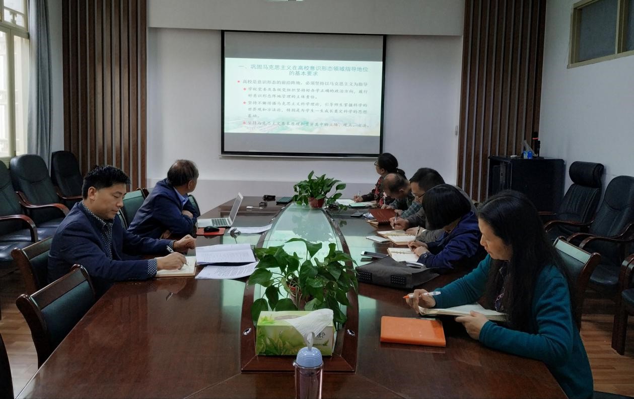 党委副书记、院长万美容就《巩固马克思主义在高校意识形态领域的指导地位》主题进行“领悟”。他结合研究和学院工作实际,围绕巩固马克思主义在高校意识形态领域指导地位的基本要求、坚持办学正确的政治方向、加强马克思主义学院建设、把加强理论研究和理论宣传作为重要任务、对接国家重大战略需求培养人才等五个方面展开。他强调指出,马克思主义是我们立党治国的指导思想,是科学的理论、人民的理论、实践的理论、不断发展的开放的理论,在社会主义意识形态领域居指导地位。马克思主义作为根本指导思想,是坚持办学正确的政治方向,这就要求我们把培养社会主义建设者和接班人作为根本任务;坚持高等教育“四为”发展方向;坚持扎根中国大地办大学,建设具有中国特色、中国风格、中国气派的哲学社会科学;加强高校意识形态阵地管理。同时,结合我院实际工作,他认为可以从教学建院、学科立院、人才强院、制度治院、党建兴院五方面着手,大力加强高校马克思主义学院建设,打造马克思主义理论教育教学、学科建设、人才培养、理论宣传和社会服务的坚强阵地。学院教师应主动投身于马克思主义特别是当代中国马克思主义研究、以习近平总书记系列重要讲话精神的研究、党中央治国理政新理念新思想新战略的研究宣传中,进行社会思潮引导。马克思主义理论人才培养是马克思主义学院的基本职责,要不断建设完善学科人才培养体系,服务国家急需的关键领域和战略必争重点领域。