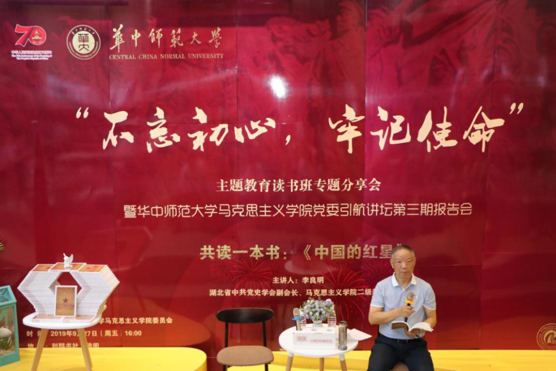 9月27日下午,“不忘初心,牢记使命”主题教育读书班专题分享会暨马克思主义学院党委引航讲坛第三期报告会在华中师范大学利群书社•倍阅书店举行。湖北省中共党史学会副会长、华中师范大学桂岳卓越教授、我院二级教授李良明围绕中国共产党人的初心与使命——以《中国的红星》为例展开主题报告。教育部直属高校“不忘初心、牢记使命”主题教育第八巡回指导组副组长张强、联络员武宇坤,学校“不忘初心,牢记使命”主题教育巡回指导第一组组长、校长助理任友洲,党委组织部副部长连海江,马克思主义学院党委理论学习中心组成员及全体学生党员和入党积极分子代表参与此次活动。活动由马克思主义学院党委书记孙永祥主持。