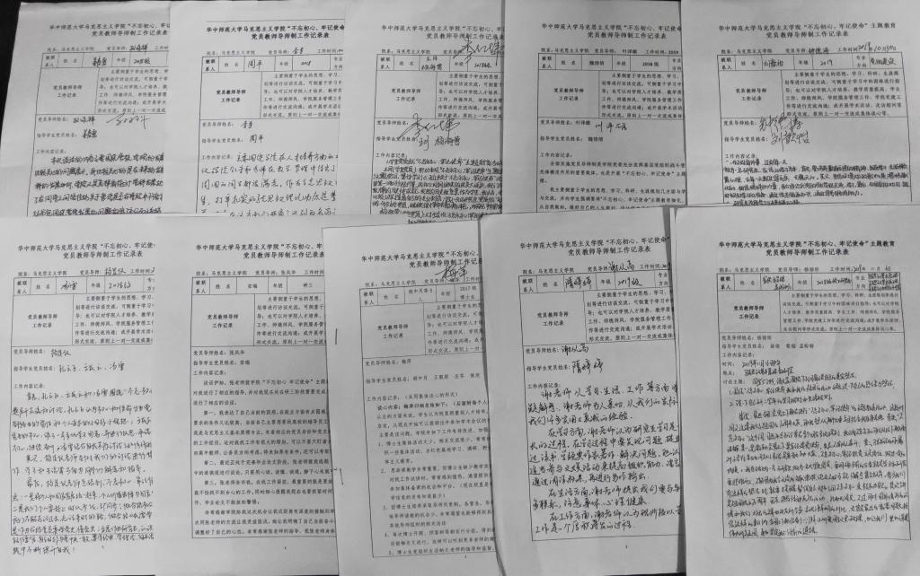 为充分实现深入学习、扎实推进,马克思主义学院党委在“不忘初心,牢记使命”主题教育工作中,开创性实施党员教师导师制、党委委员联系党支部制。实施每个教工党支部对口联系1-2个学生党支部,每位教师党员联系3-6名学生党员,开展一对一谈心、集体谈心、学术交流、走访慰问等多种形式的导师结对。