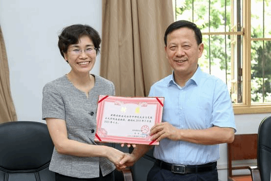 会议伊始,钟选友介绍了出席本次会议的来宾,万美容院长介绍了陈金龙教授的基本情况。随后,校党委书记黄晓玫向陈金龙教授颁发聘书。