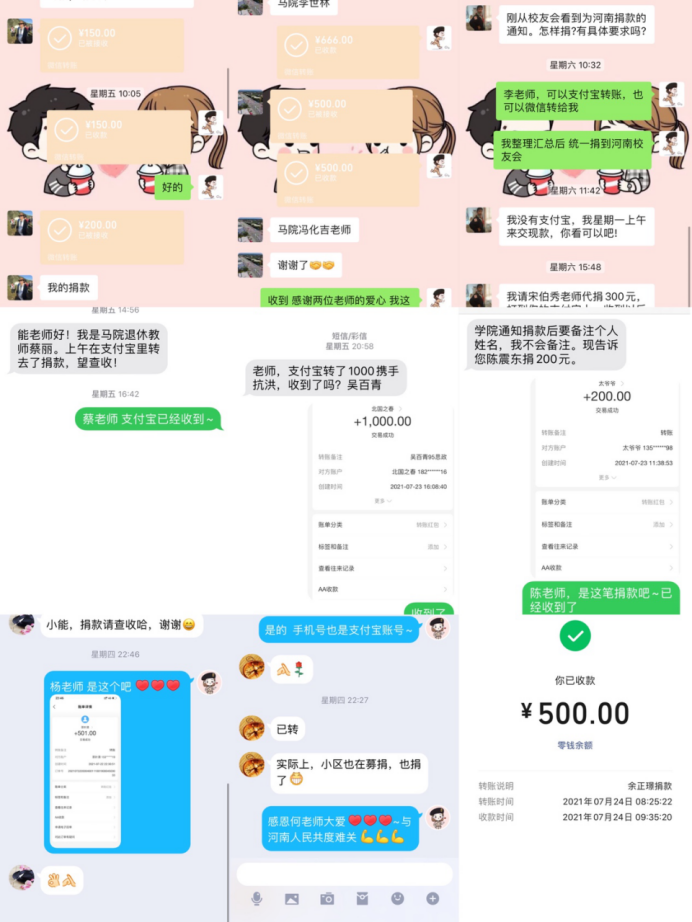 捐款不计多寡,善举不分先后,自马克思主义学院发布《“携手抗洪,我们与河南校友肩并肩”华中师范大学马克思主义学院募捐倡议书》以来,学院在职教职工、退休老教师、本科生、硕士生、博士生等积极响应,个别校友闻讯也参与爱心援助,纷纷慷慨解囊伸出援手,通过微信、支付宝等捐款方式,为抗击洪灾贡献自己的一份力量,截止7月26日,短短三天时间学院就汇集到爱心捐款110余笔,筹集善款28815元。 “河南挺住!”“河南加油!”“老家河南,共渡难关!”“钱虽小也是一份心意,期盼河南人民一切顺利,平平安安!”“华师马院与河南校友肩并肩!” “愿国家风调雨顺,愿人民幸福安康!”……风雨同舟,守望相助,一份份暖心的祝福汇聚成磅礴的力量,帮助受灾的河南校友和同胞树立更强大的信心,早日重建家园!