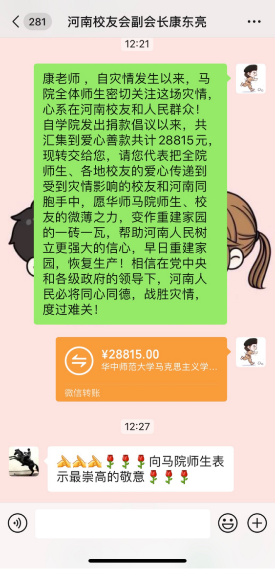 八方驰援暖人心,勠力同心渡难关,学院师生、校友自发捐赠充分体现了马院人“一方有难、八方支援”的家国情怀,也诠释了马院人勇于担当,主动作为的社会责任感和使命感。相信河南校友和人民在党中央和各级政府的坚强领导下,必将同心同德,战胜灾难,重建家园,愿马院全体师生、校友的绵薄之力,变作重建家园的一块砖、一片瓦,助力河南同胞齐心协力打赢这场防汛攻坚战!