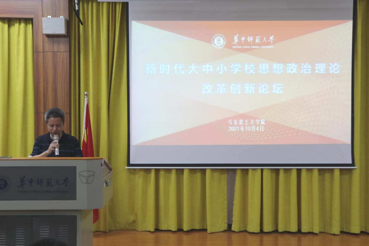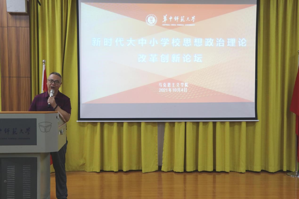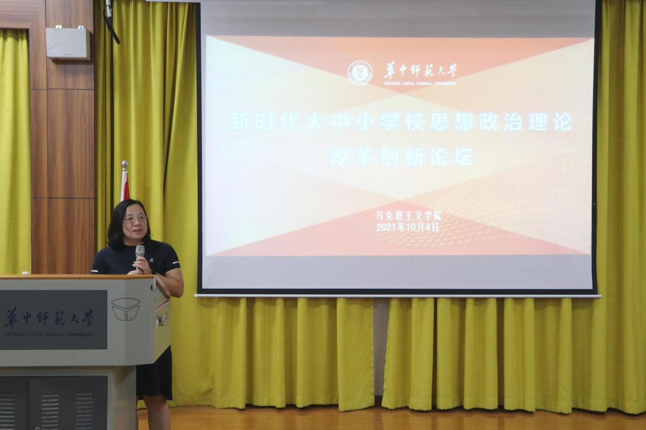 马克思主义学院讯(通讯员 张志庭;摄影 徐婷婷)10月4日上午,为厚植教育情怀,扎根基础教育,培养优质师资,提升教育质量,“新时代大中小学校思想政治理论改革创新论坛”在华中师范大学一号教学楼1101教室隆重举行。华中师范大学马克思主义学院院长万美容、副院长邵彦涛、副院长李芳以及众多毕业于华中师范大学马克思主义学院(包括本科、双学位、硕士、博士等,涵盖政治系、政治教育系、法商学院、政法学院、理论课部、马克思主义学院等)、工作在基础教育一线的中小学教师和教育教学管理人员参加论坛活动。论坛由胡田庚教授主持。