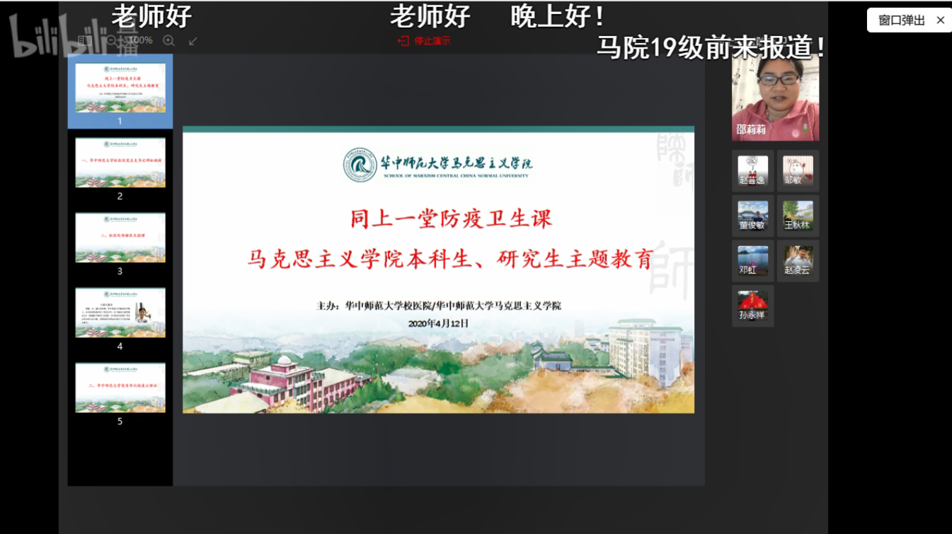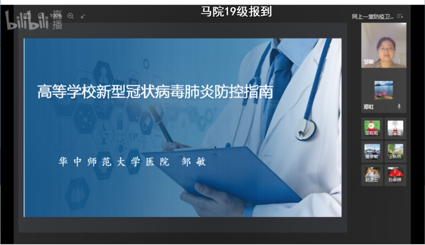 19点整,同学们在陈远瞻的组织下准时进入直播间,与马克思主义学院全体本科生、研究生同上一堂防疫卫生课。本次课程由华中师范大学校医院和马克思主义学院联合举办。华中师范大学党委书记赵凌云、校医院党总支书记邓虹、马克思主义学院党委书记孙永祥、党委副书记邵莉莉等出席会议。本次会议由邵莉莉主持。