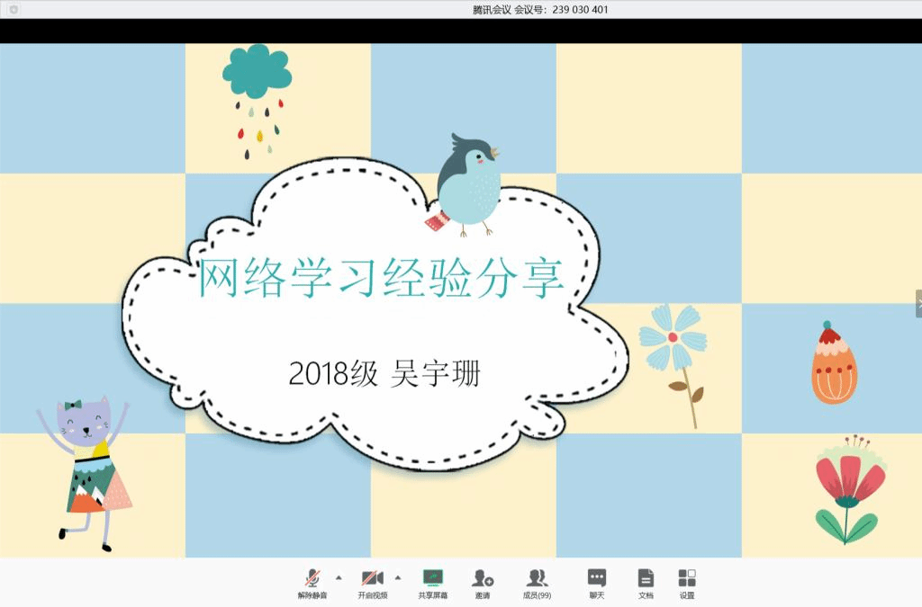 18点整,晚点名正式开始。2019级本科生辅导员陈远瞻出席并主持。2018级吴宇珊同学和2019级李钟文同学分别向大家分享了自己的线上学习经验。作为学姐,吴宇珊结合自身经历,从“时间管理”、“网课笔记”、“高效阅读”以及“搜集资料”四个方面,解答同学们在网课期间提出的相关问题,提供时间轴、思维导图等学习方法和OneNote等学习软件,帮助同学们督促自己、实现高效学习。李钟文则通过展示“打油诗”和“对联”的幽默方式,分析线上学习的优缺点,分享了自己的日常学习情况。在两位同学发言完毕后,陈远瞻对此次分享表示感谢,并希望同学们加强自我督促,合理利用时间,认真进行线上学习。