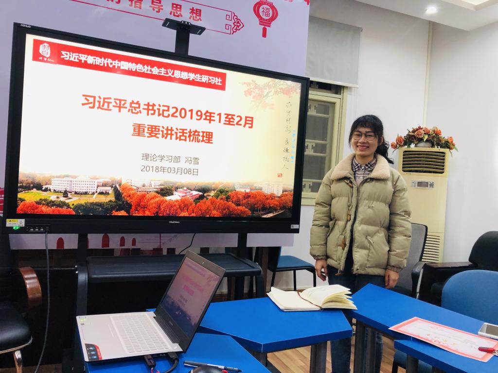 本次理论学习共有三个环节:第一,梳理习近平总书记2019年1-2月重要讲话;第二,主题宣讲:全面建成小康社会——精准扶贫战略;第三,学习2019年政府工作报告。理论学习部冯雪对习近平总书记2019年1月至2月的重要讲话进行了梳理,并就大家普遍关注的相关问题进行了深度发掘,研习社成员踊跃发言,积极交流,气氛融洽,学术氛围浓厚。