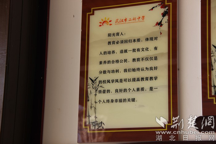 据了解,武汉市二桥中学2007年成为课改名校,秉承“阳光教育”办学理念,让学生感受阳光般温暖,让每个学生都有阳光心态。经多年积淀,已形成了“礼、真、严、毅”的校风、“乐、思、勤、实”的学风和“爱、容、范、精”的教风。