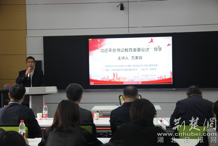 荆楚网客户端—荆楚网消息(记者许文秀、赵胜豪 通讯员杨学工)中学阶段是学生世界观、人生观、价值观形成的关键时期。一堂好的思政课,对于引导学生树立正确价值观极为重要。10月30日,武汉市二桥中学芳草校区迎来了一堂“特殊”的思政课,华中师范大学马克思主义学院院长万美容教授为汉阳区七八年级思政教师、张婷婷名师工作室教师及二桥中学全体教师们做“思政课”向导。