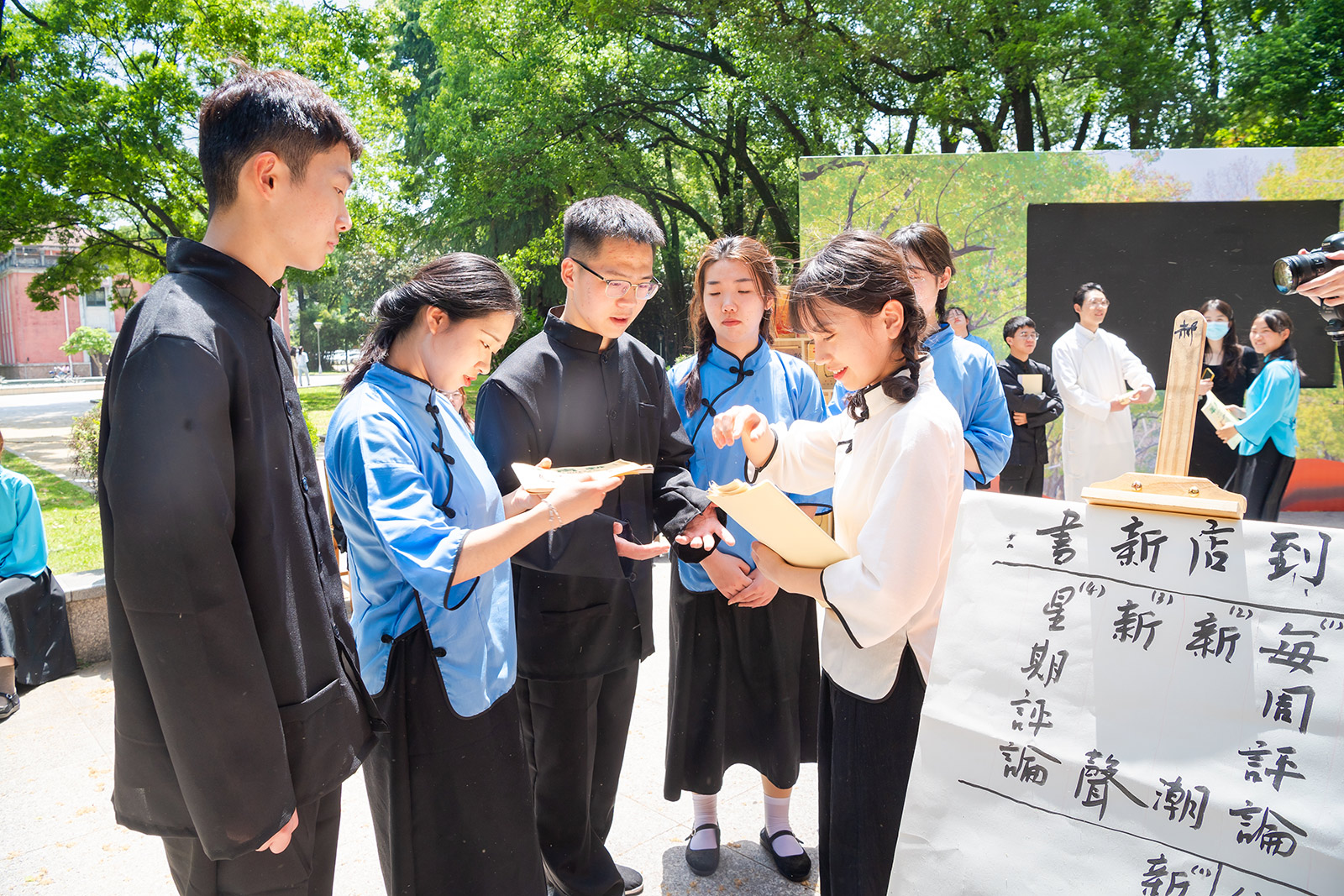 华大在线讯(记者 陈嘉玲)4月29日,《你好,恽代英》原创沉浸式主题教育话剧在恽代英广场上演。马克思主义学院师生通过现场短剧表演,原景再现恽代英革命生涯中的四个经典瞬间,以此纪念恽代英壮烈牺牲90周年。师生在身临其境的体验中,原汁原味学习红色历史,创新党史学习教育形式。