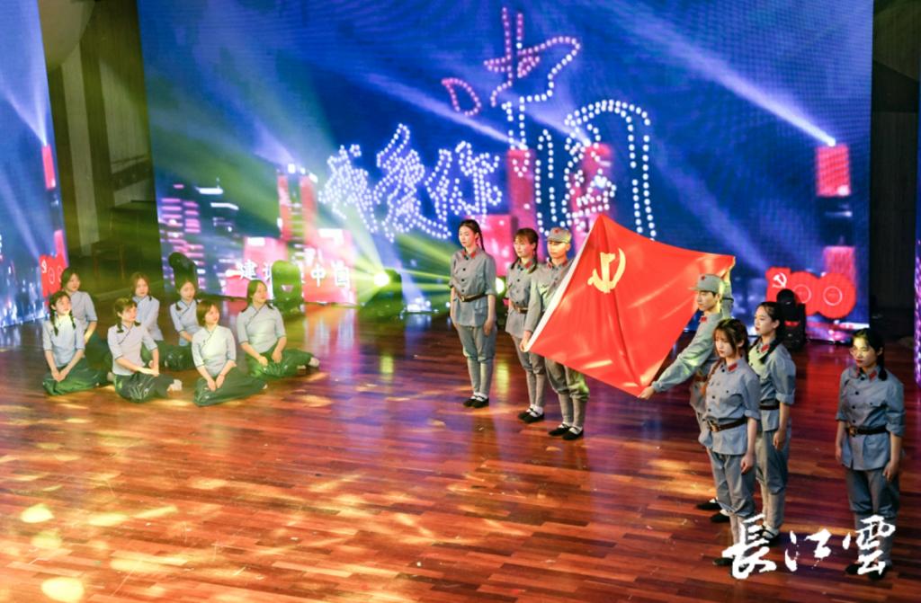 学生原创沉浸式主题教育话剧《你好,恽代英》截取恽代英一生中的重大时刻和事件,以恽代英参与五四运动、创办利群书社、主编《中国青年》、被捕入狱等一系列事件为引,讲述了他在黑暗中寻求救国救民真理的革命故事。情景剧《谁是最可爱的人》带领师生跨越时空,亲身体会战士们保家卫国、英勇奋战的精神。影子戏《绣红旗》,讲述着过去党员的感人故事,表达着对未来的美好希冀。服装秀《百年铸辉煌,芳华绣新裳》在展示中华传统服饰之美的同时,也传承着党的深厚文化。在红船上宣告中国共产党第一个纲领诞生、红军过草地翻雪山、遵义会议召开确立了以毛泽东为代表的新的中央正确领导、刘胡兰英勇就义、中华人民共和国第一面国旗诞生、邓小平南巡汫话、抗洪抢险、脱贫攻坚等等一幕幕、一个个重要时刻重大事件重要人物搬上舞台,全景呈现,让全场师生重温党史,心灵受到洗礼。