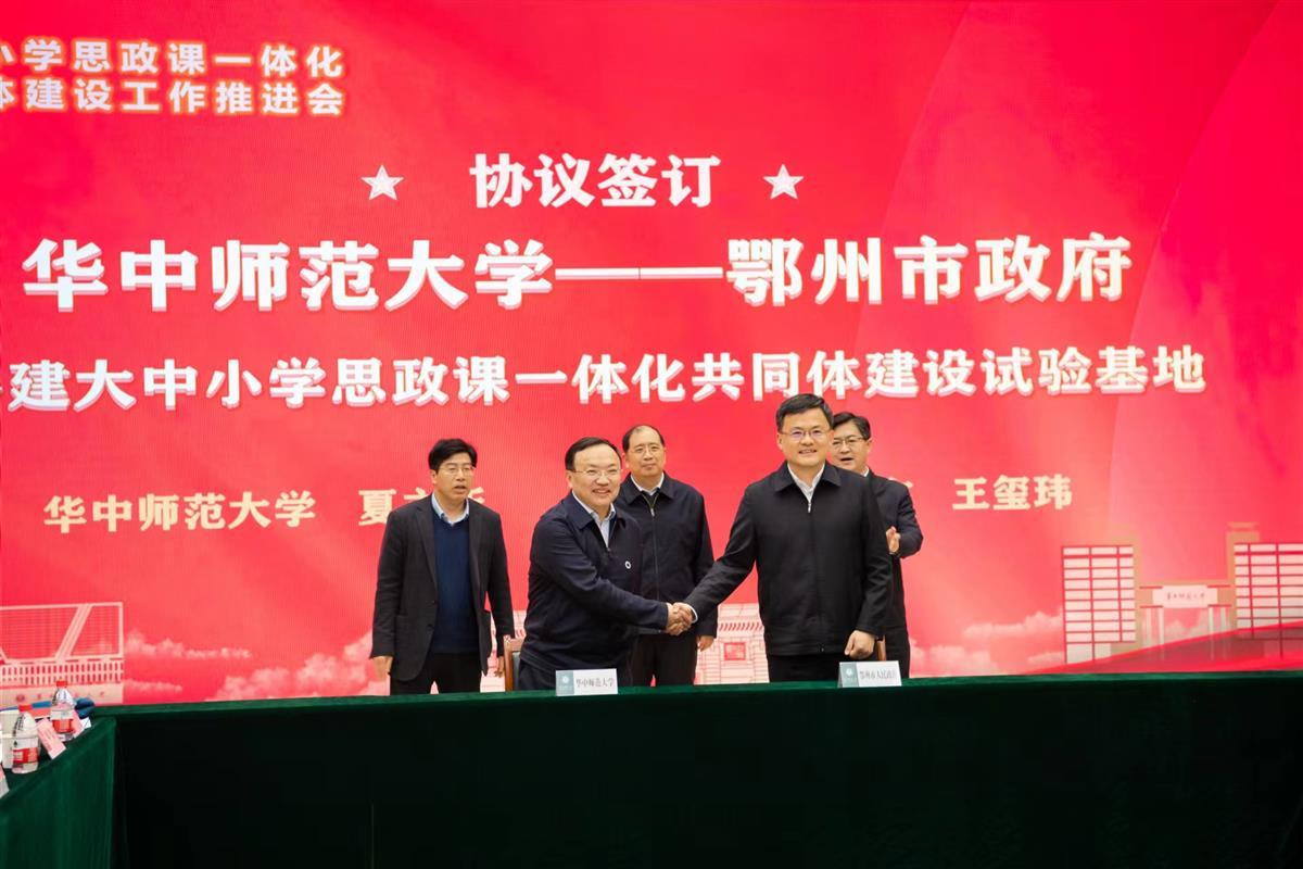 会上,华中师范大学和鄂州市政府签订共建大中小学思政课一体化共同体建设试验基地框架协议。鄂州市、武汉大学、华中科技大学、宜昌市教育局、红安县第一中学作发言交流,介绍了各自的经验做法。
