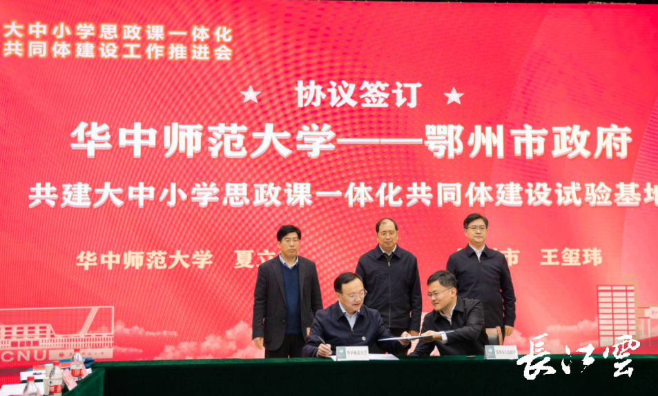 会上,教育部大中小学思政课一体化共同体(湖北省)建设正式揭幕。华中师范大学、鄂州市政府双方共同签署了大中小学思政课一体化共同体建设试验基地框架协议。鄂州市、武汉大学、华中科技大学、宜昌市教育局、红安县第一中学等五家单位作交流发言。