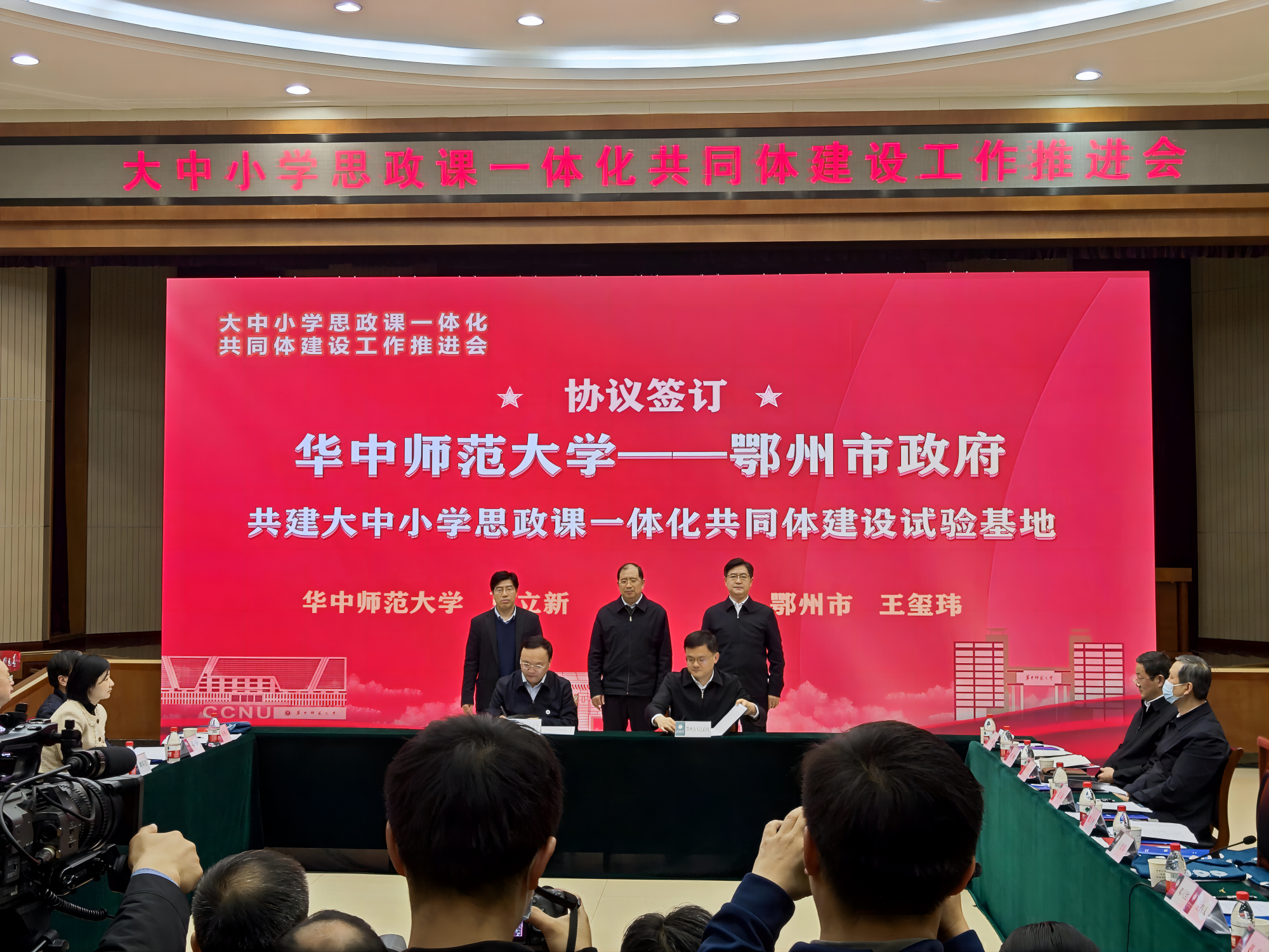 会上,教育部大中小学思政课一体化共同体(湖北省)建设正式揭幕。在省委教育工委、省教育厅、鄂州市、华中师范大学三方见证下,华中师范大学夏立新和鄂州市王玺玮代表双方签订华中师范大学——鄂州市政府共建大中小学思政课一体化共同体建设试验基地框架协议。鄂州市、武汉大学、华中科技大学、宜昌市教育局、红安县第一中学等五家单位作发言交流。